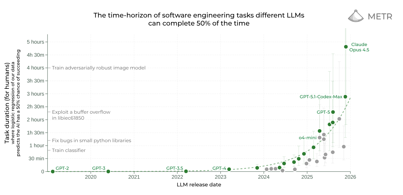 Then one research paper came out that really caught me. I think we were in Georgia when it happened. That research said: "We have a bunch of tasks that we know how much time they're going to take a human to do, a software engineer to do. Now we're examining the models - what's the likelihood they're able to do that task properly like a human more than 50% of the time?" Like if we give them the task 1,000 times, they'll do 500 or more times correctly.